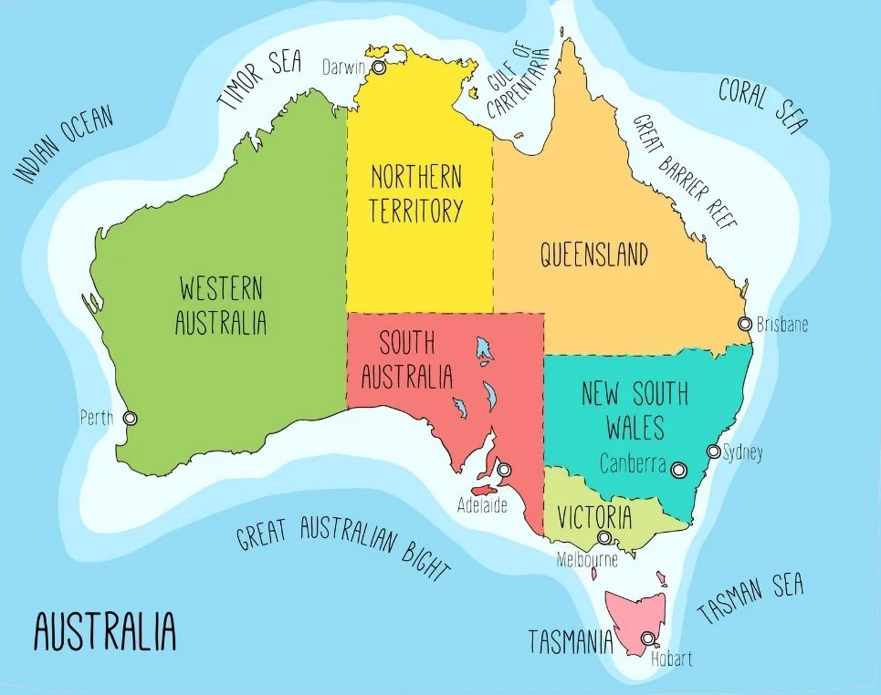 Australia became a nation in January 1901. It is divided into 6 states and 2 territories: New South Wales, Queensland, South Australia, Tasmania, Victoria, Western Australia and the Northern and Australian Capital Territories.